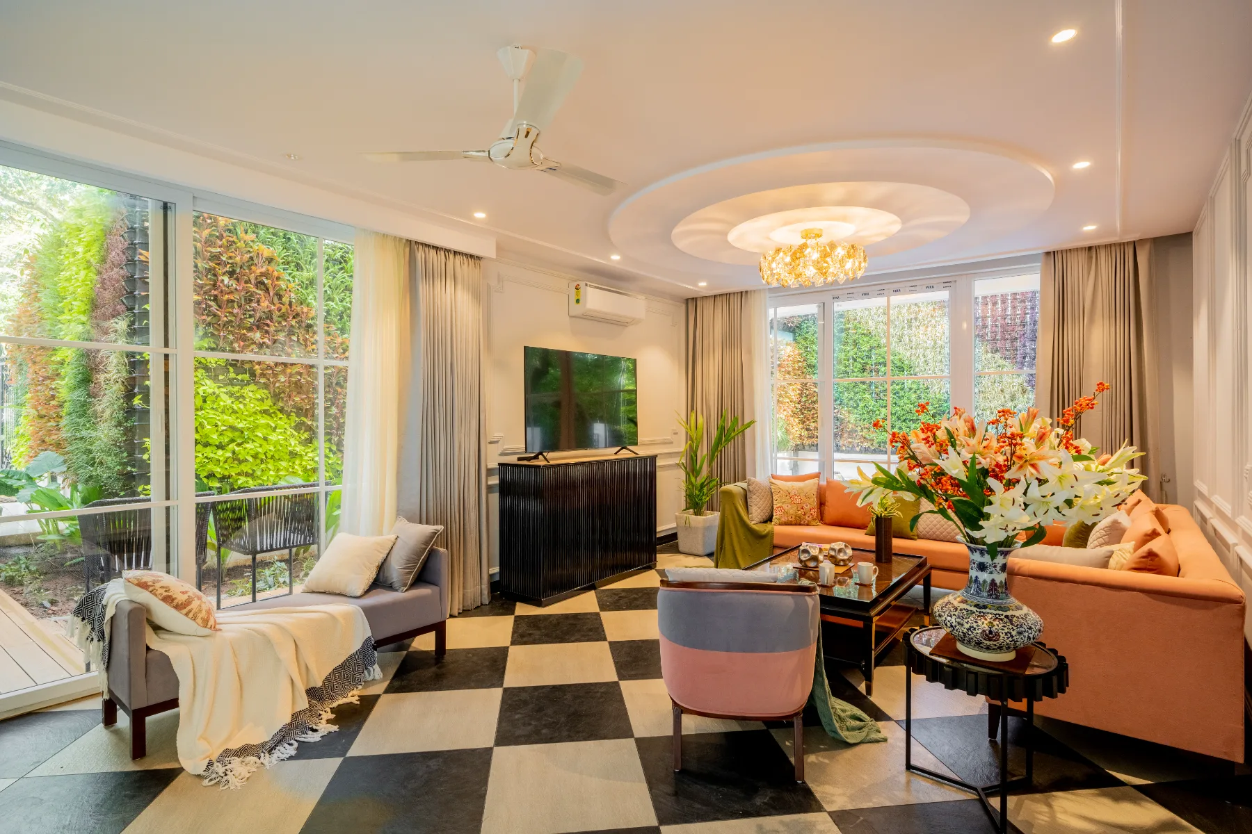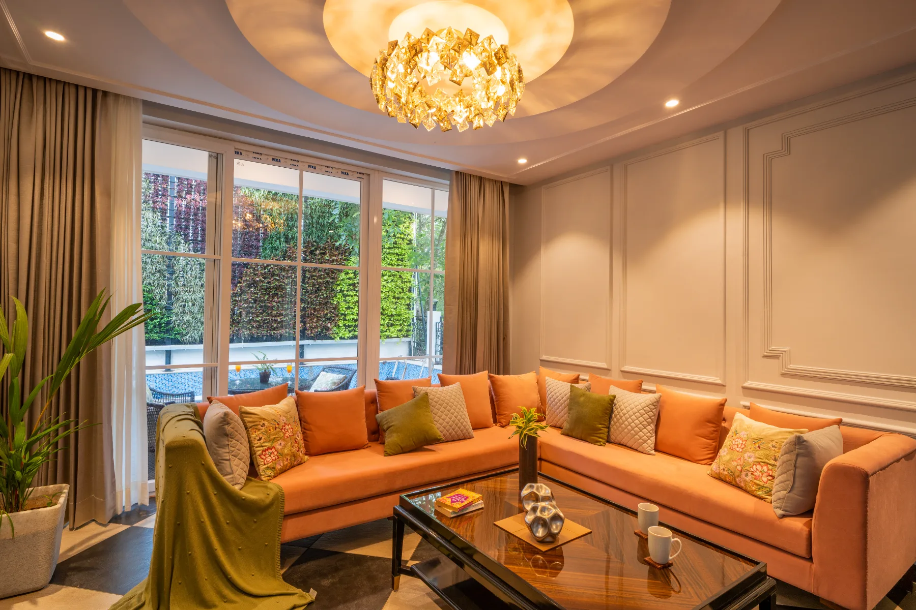 As you step inside, a welcoming seating area leads into a calm passageway. A glass window softly brightens the space while a stylish bedroom and powder room sit conveniently along the entrance corridor. Moving further inside, the home opens into the Hall of Grandeur — an expansive living area adorned with elegant furnishings, a stunning chandelier, tasteful décor, and a music system. Large glass windows frame unobstructed views of the pristine pool and garden, allowing natural light to flood the space and enhance the villa’s open, airy feel. Four air-conditioning units keep the interiors perfectly comfortable.