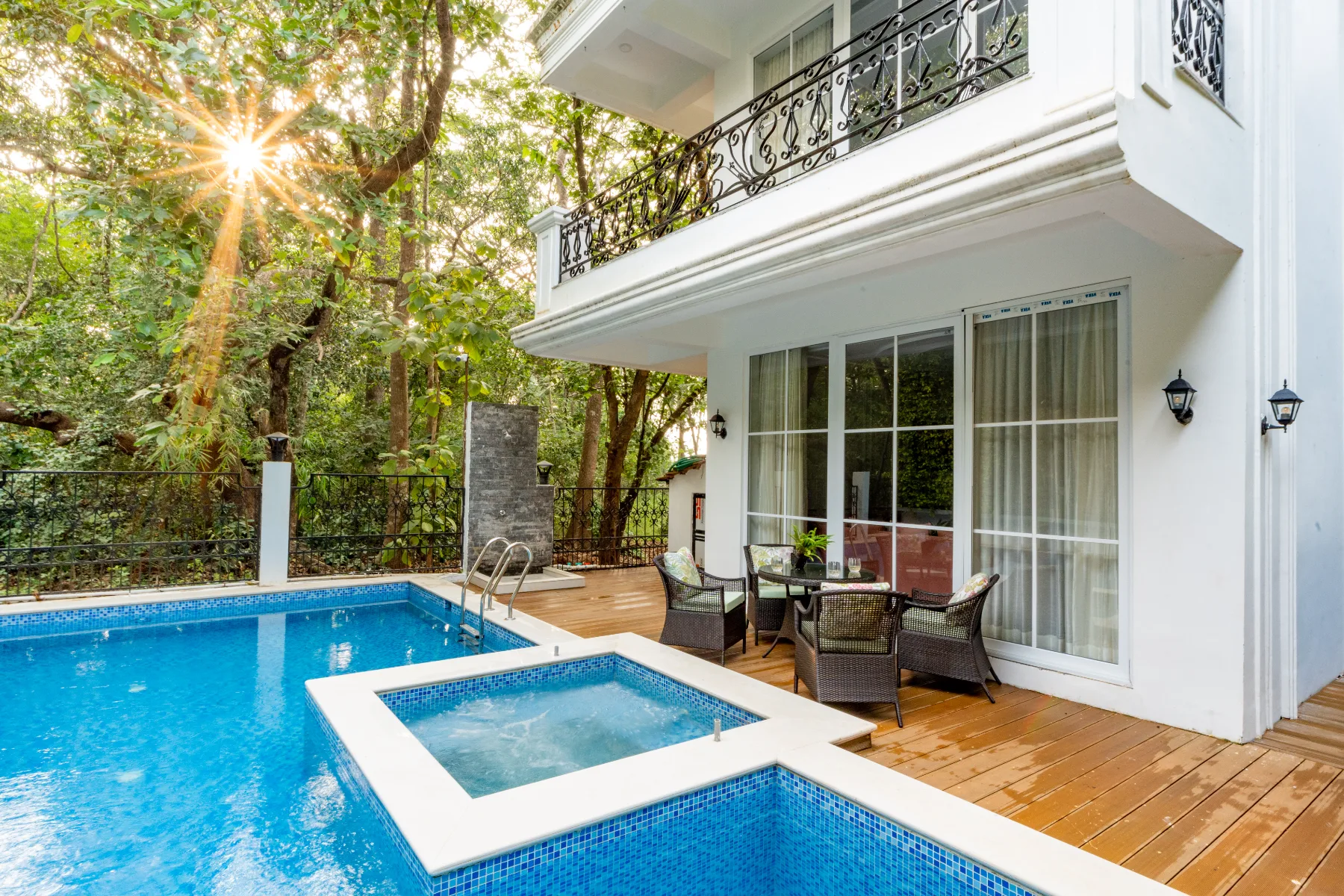 Step outside to discover Lagoon Oasis — the villa’s stunning private pool area. A beautifully landscaped green wall surrounds the pool deck, where guests can relax beside the sparkling jacuzzi or unwind under the outdoor bar counter with plush sofa seating. A four-seater patio set makes it the perfect space for poolside drinks and evening conversations.