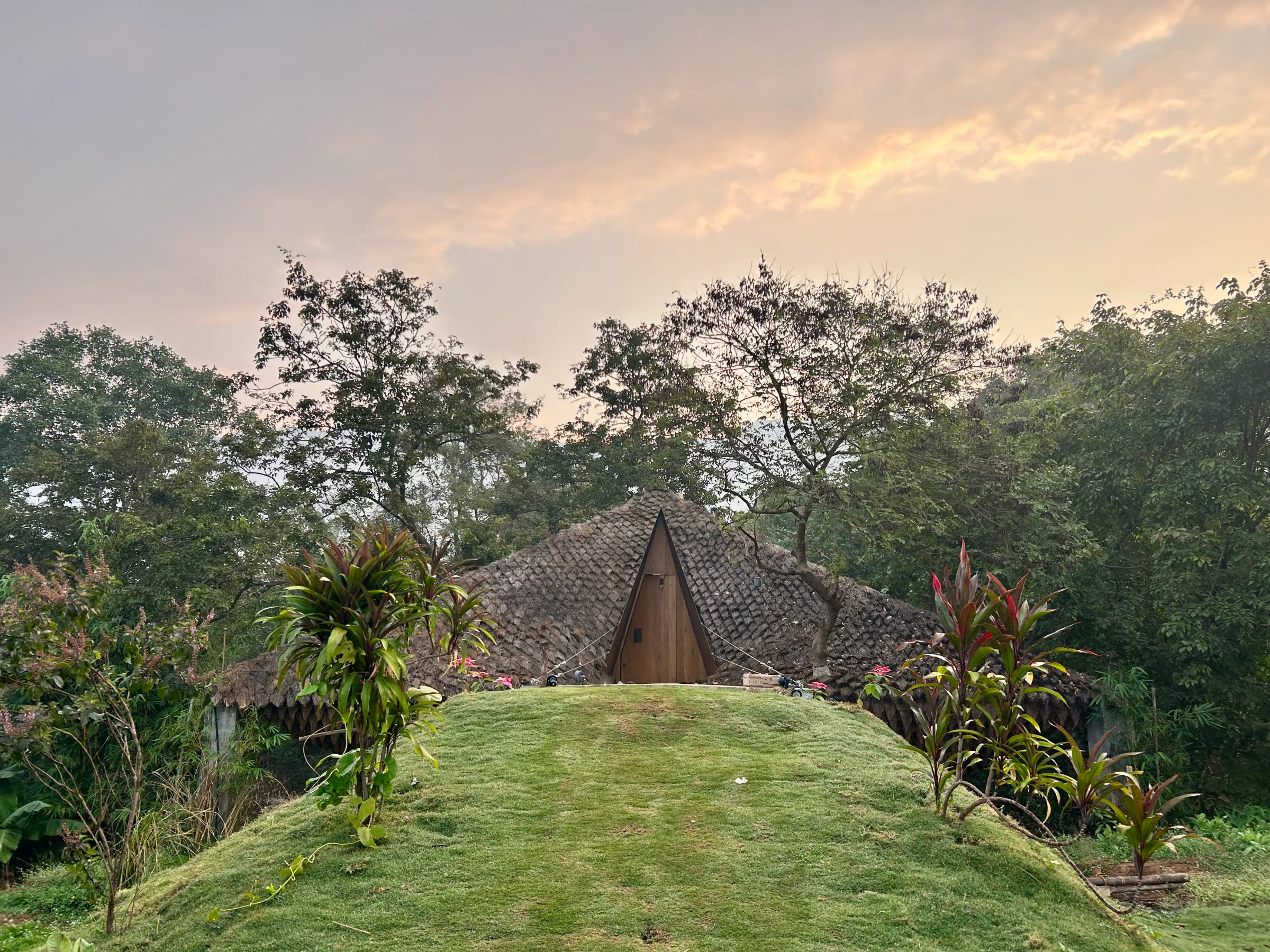 Step inside and you’re welcomed into a dramatic central living space crowned by a skylit oculus — an architectural highlight that invites sunlight, fresh air, and even the gentle rhythm of rain into the heart of the home. Crafted using steel, mud plaster, and locally sourced materials, every element blends modern design with earthy warmth, creating a calm, sensory atmosphere that encourages you to slow down.