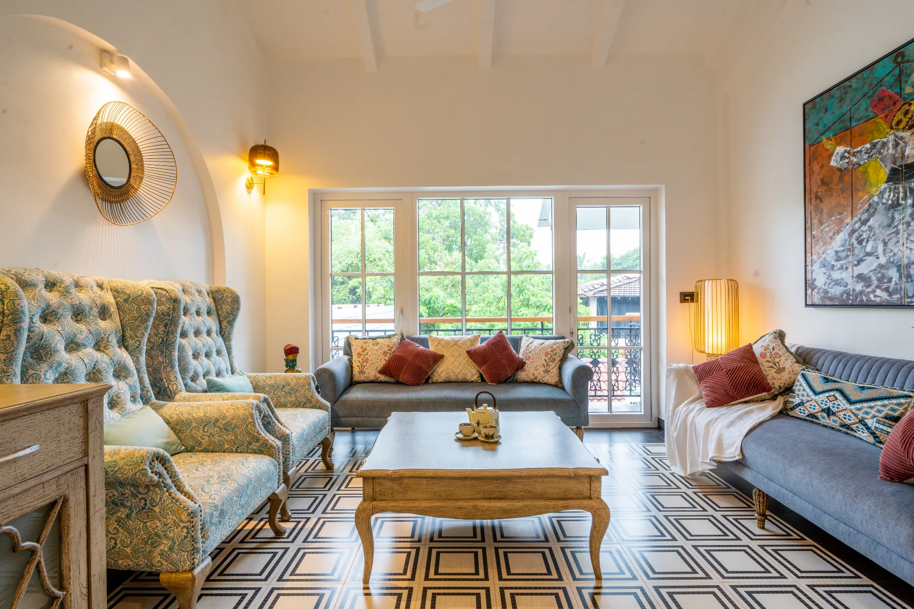 Located in the charming village of Assagao, close to Vagator Beach and Chapora Fort, this is a luxurious 5-bedroom retreat designed for guests seeking comfort, style, and tranquillity in North Goa. The villa offers an elegant living space that blends contemporary design with classic decor elements, featuring plush blue sofas adorned with patterned cushions. Soft overhead lighting and stylish wall sconces create a warm and welcoming atmosphere.