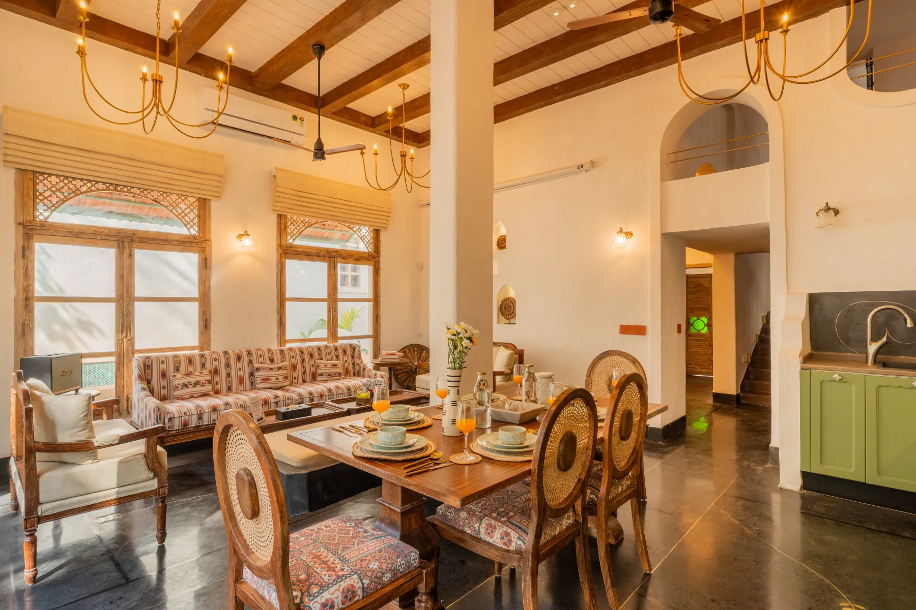 The 1000 sq. ft. living room is designed for both comfort and connection, featuring plush seating, handcrafted décor, Marshall speakers, chandeliers, and seamless pool access through floor-to-ceiling glass doors. The adjacent dining space with a 6-seater table and rustic mirror corner creates the perfect setting for intimate meals, while the fully equipped modern kitchen caters to both self-cooking and chef-curated experiences.