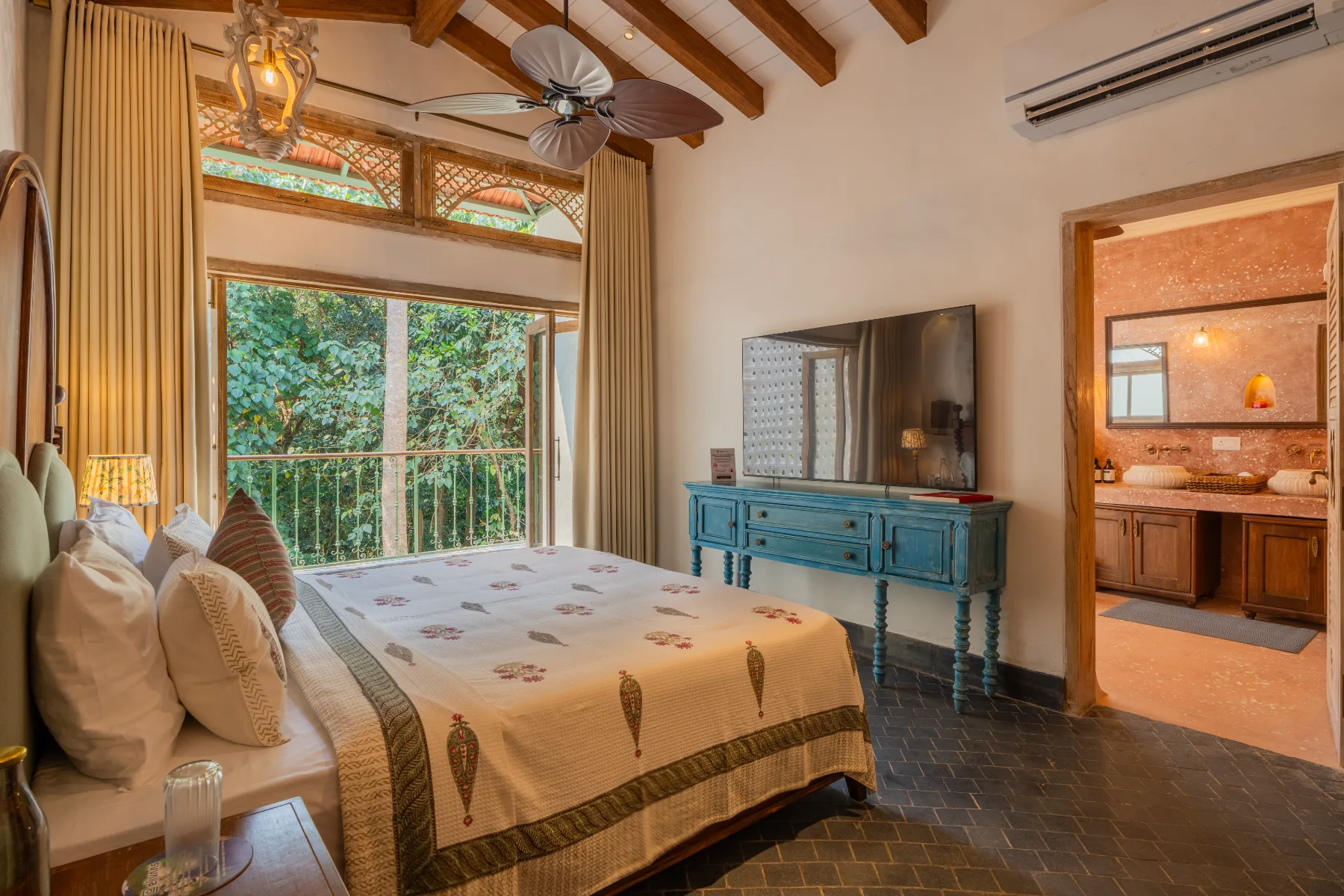 Hidden amidst the lush palms of Assagao, this thoughtfully designed eco-luxury villa invites you to experience Goa through a lens of calm indulgence and conscious living. Built using sustainable materials like lime plaster, teakwood, and recycled terrazzo flooring, the villa blends timeless Indo-Portuguese architecture with modern luxury—creating a stay that feels both grounded and elevated.