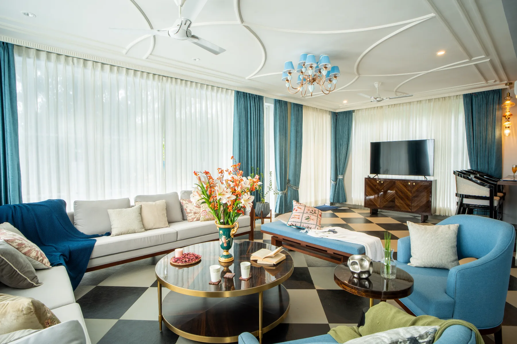 Inside, The Ivy Grand Hall forms the heart of the home — a grand living area filled with natural light from expansive windows. The space features sophisticated chequered flooring, intricate ceiling details, and elegant furnishings that create a modern yet inviting atmosphere. A chic bar counter, powder room, and convenient lift access enhance the functionality of the space, while subtle pops of colour against a neutral palette bring warmth and personality to the interiors.